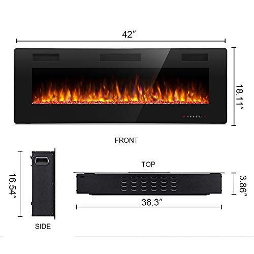 - Multiple Install Methods:This electric fireplace not only can be Recessed or semi recessed in wall but also can be Wall Mounted, This 42-inch-wide electric fireplace only weighs 42.9pounds, so one person can easily hang it on the wall using the step-by-step instructions provided. Once it has been mounted to your wall, all you need to do is hang and secure your fireplace with the drywall screws. Overall dimensions: 42” x 18.11” x 3.86”