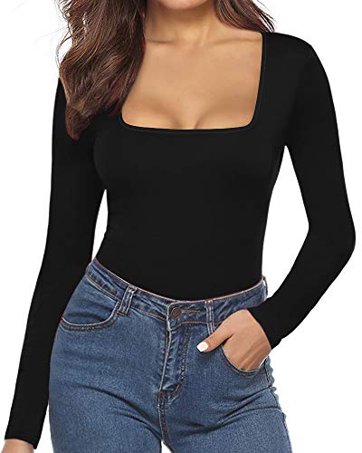 MANGOPOP Women's Square Neck Short Sleeve Long Sleeve Tops Bodysuit Jumpsuit (B Long Sleeve Black, Medium)